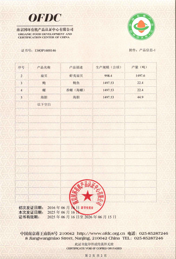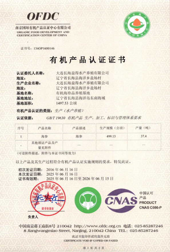 有机产品认证证书